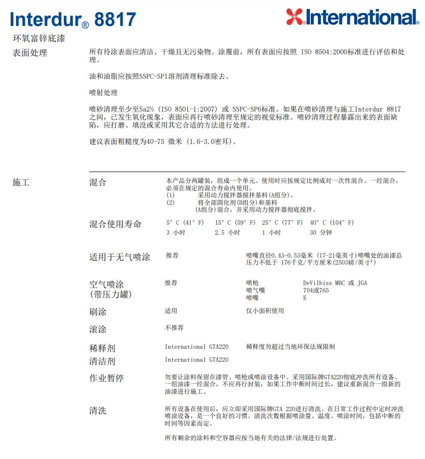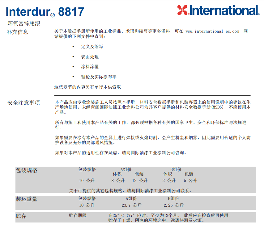 产品简介:AkzoNobel 阿克苏国际油漆Interdur 8817是一种底漆,作为防腐涂料系统的一部分,用于新建结构,可为各种恶劣腐蚀性环境提供额外的保护作用,包括:陆上沿海结构、石化设备、造纸厂、桥梁和发电厂。